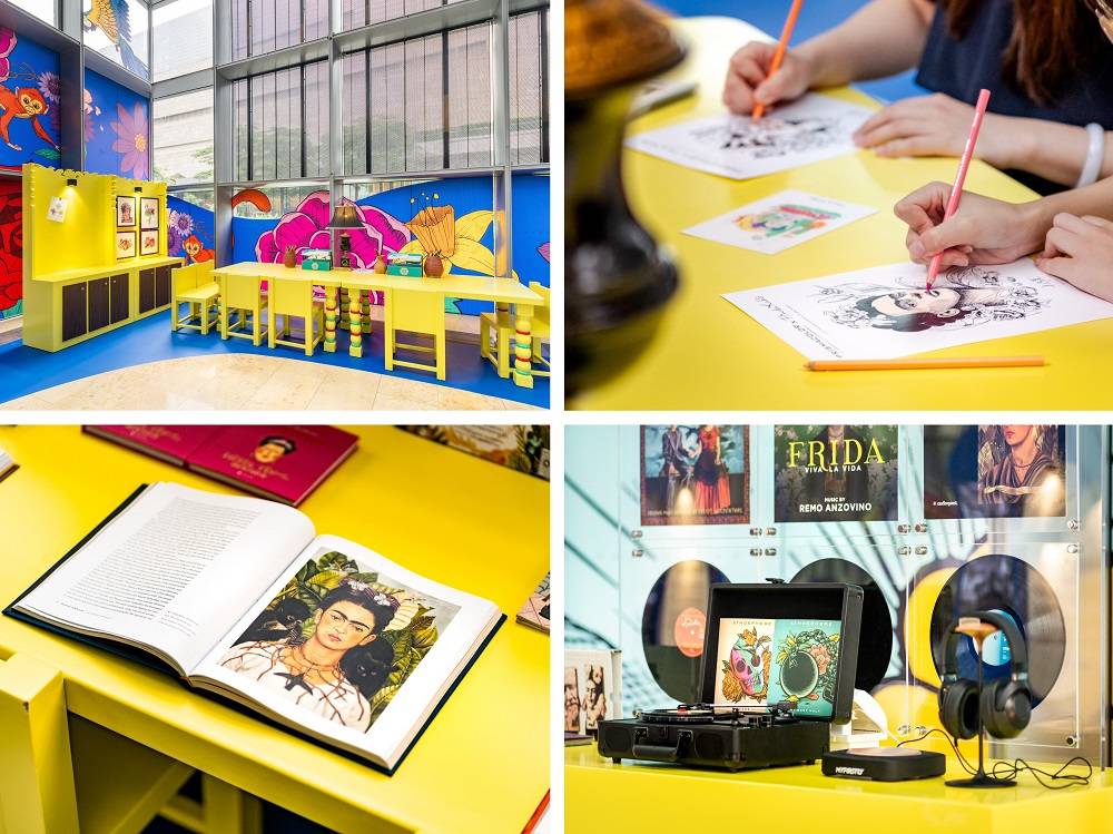 此外,在三楼展厅内特别设置了多样的互动体验区。阅读区中陈列了琳琅满目的弗里达主题书籍,包括进口原版的《弗里达·卡罗日记》和适合儿童阅读的《小指南大人物》等,引领不同年龄段的观众近距离了解这位女性艺术家的创作生平。绘画区中,美国知名彩铅品牌prismacolor(霹雳马)特别赞助了铅笔和绘本等画材,观众可以在此亲自创作,描绘自己心中的那朵“夏花”。黑胶区中将会播放一张名为frida kahlo vs. ezra pound的黑胶音乐唱片,观众可在现场佩戴耳机,聆听音乐中的细腻情感,让思绪伴随着旋律在这座“蓝房子”中飞扬。在这里,每位观众都能通过多样且独特的方式与弗里达“对话”,体验一段跨越时空的艺术与文化之旅。